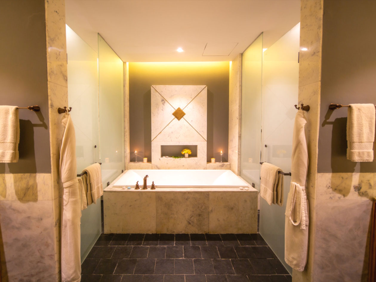 shower, separate bathtub, hairdryer, bathrobe and slippers.