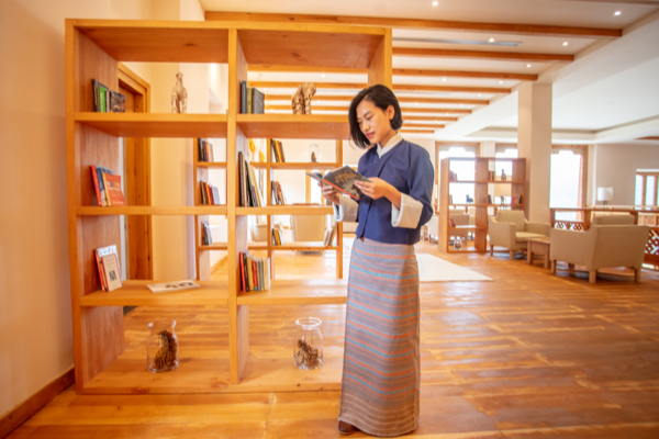 We kindly invite guests to explore the varied collection of books and magazines on well-being, meditation, yoga, mindfulness and travelling in our elegant library, which is decorated by wall covering tapestries of the former Bhutanese kings.
