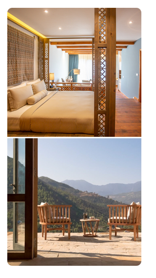 All our rooms have a beautiful view of the scenic Neyphu Valley. The Terrace room has 54m2 of floor space and a 8m2 big terrace. The room houses a sitting area with a coffee table, sofa and a comfortable chair, a dinner table with two chairs and a work desk. The terrace has a table, two chairs and an umbrella. The bathroom has floor heating, a bathtub, a separate walk-in shower, hairdryer, bathrobe, slippers and locally handmade bathroom amenities.