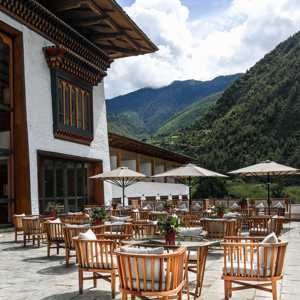 The restaurant terrace is the perfect place to enjoy the warmth of the fire place and a beautiful view of the Neyphu valley.